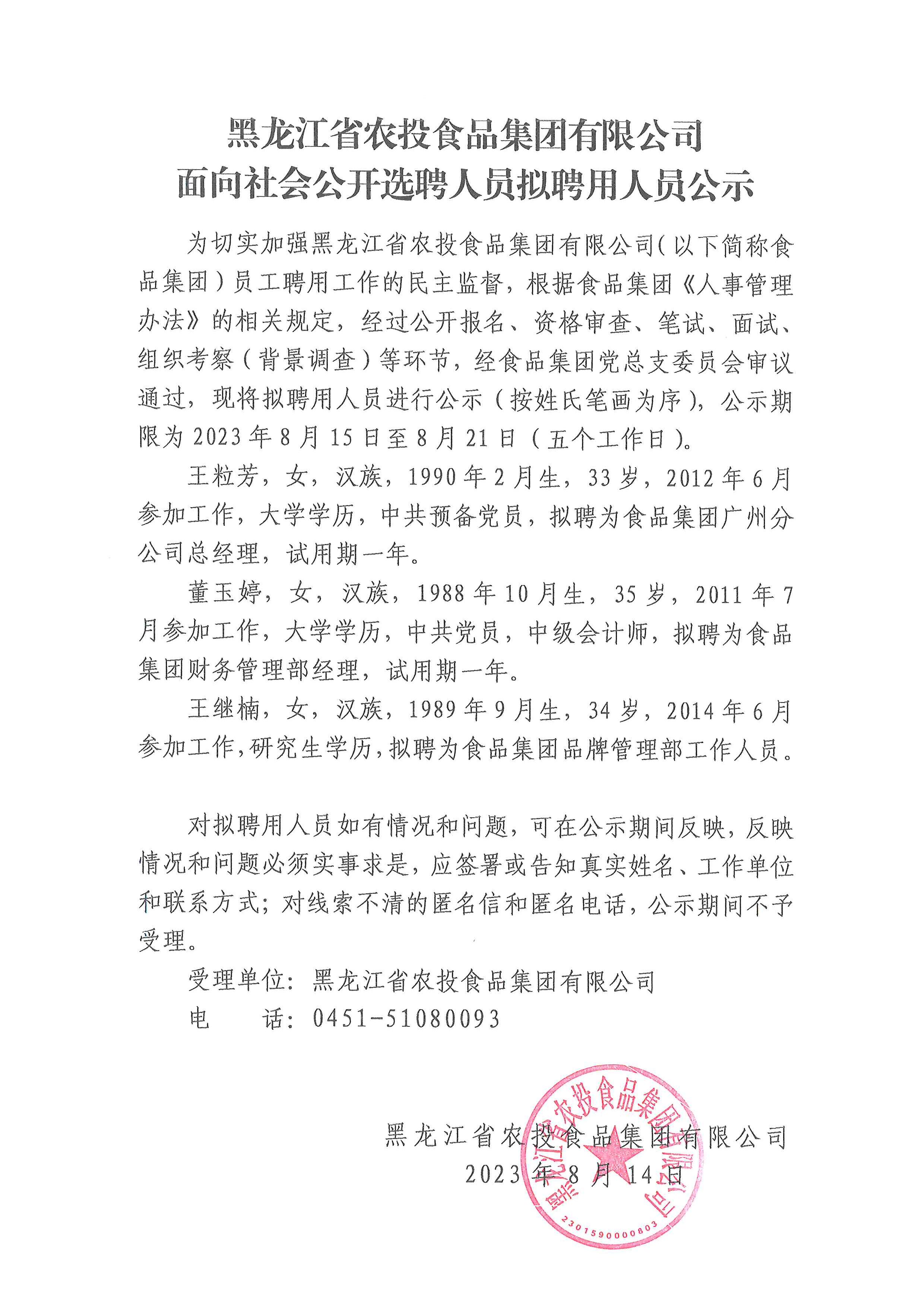 黑龍江省農(nóng)投食品集團(tuán)有限公司面向社會公開選聘人員擬聘用人員公示