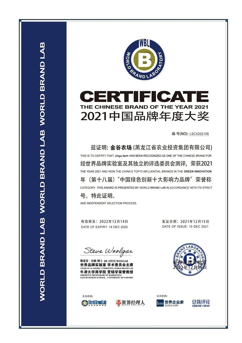 2021年12月15日,2021年“中國品牌年度大獎”評選揭曉,農(nóng)投集團旗下“金谷農(nóng)場”品牌在此次評選中榮獲“中國綠色創(chuàng)新十大影響力品牌”。