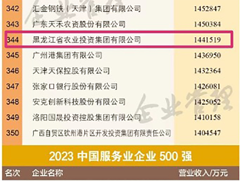 2023年9月20日,中國企業(yè)聯(lián)合會、中國企業(yè)家協(xié)會發(fā)布“2023中國服務(wù)業(yè)企業(yè)500強”榜單,黑龍江省農(nóng)業(yè)投資集團有限公司(以下簡稱“農(nóng)投集團”)連續(xù)三年榮登“中國服務(wù)業(yè)企業(yè)500強”,以144億元的營業(yè)收入,位列“2023年中國企業(yè)500強”第344位,位次較2022年度上升24位!