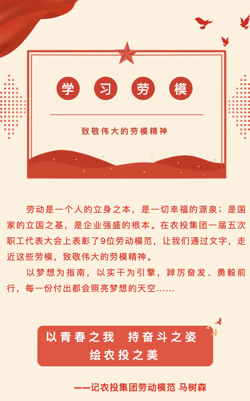 這是馬樹森在農(nóng)投集團企業(yè)日寫下的《沁園春·創(chuàng)業(yè)記》,一直以來他時刻保持著這股創(chuàng)業(yè)的精氣神,敢拼敢闖敢干,不畏懼不氣餒不抱怨,在平凡的崗位上創(chuàng)不凡,在普通的工作中干出彩,成為農(nóng)投青年人學習的榜樣。