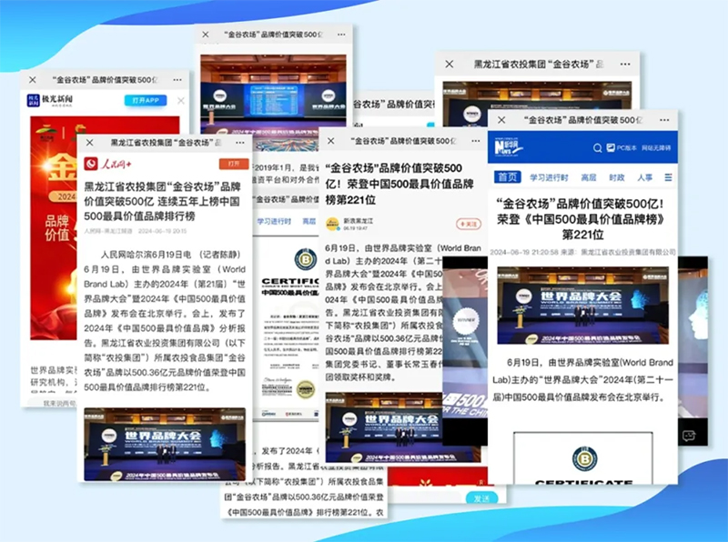 近日,黑龍江省農(nóng)業(yè)投資集團有限公司(以下簡稱“農(nóng)投集團”)“金谷農(nóng)場”品牌以500.36億元品牌價值榮登2024年中國500最具價值品牌排行榜第221位。五年五大步,“ 金谷農(nóng)場”品牌價值再攀新高,位居中國農(nóng)業(yè)品牌排名第八!新華網(wǎng)、人民網(wǎng)、黑龍江日報、龍頭新聞、極光新聞、新浪網(wǎng)等媒體紛紛報道。