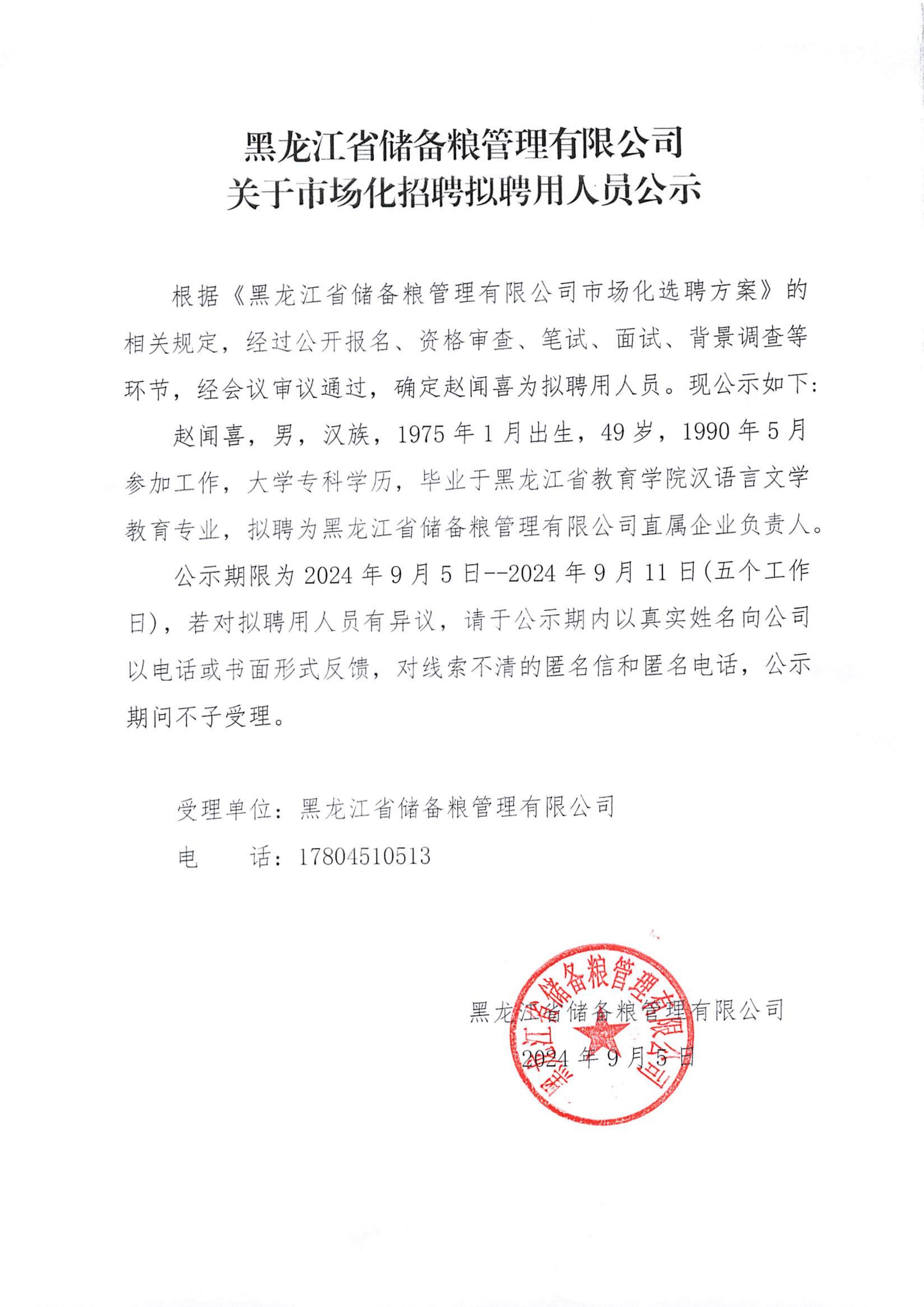 黑龍江省儲(chǔ)備糧管理有限公司關(guān)于市場(chǎng)化招聘擬聘用人員公示