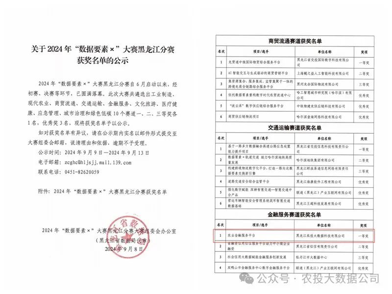 9月9日,大數(shù)據(jù)公司參加的2024年“數(shù)據(jù)要素X”大賽黑龍江分賽決賽結(jié)果出爐。大數(shù)據(jù)公司參賽項(xiàng)目“農(nóng)業(yè)金融服務(wù)平臺(tái)”在金融服務(wù)賽道中榮獲一等獎(jiǎng),將代表黑龍江省參加全國(guó)總決賽,展現(xiàn)我省在農(nóng)業(yè)金融服務(wù)領(lǐng)域的創(chuàng)新實(shí)力!