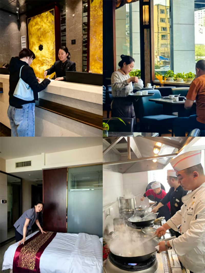 清晨六點(diǎn),天剛蒙蒙亮,廚房已飄出陣陣香氣,廚師團(tuán)隊(duì)早已穿戴整齊,開(kāi)始為早餐供應(yīng)做準(zhǔn)備。在五一用餐高峰期,廚師們顛勺翻炒的節(jié)奏快如鼓點(diǎn),砧板上的切菜聲、油鍋的滋啦聲交織成激昂的交響曲。服務(wù)員的腳步聲、賓客觥籌交錯(cuò)的碰杯聲,共同奏響了熱鬧非凡的假日樂(lè)章。