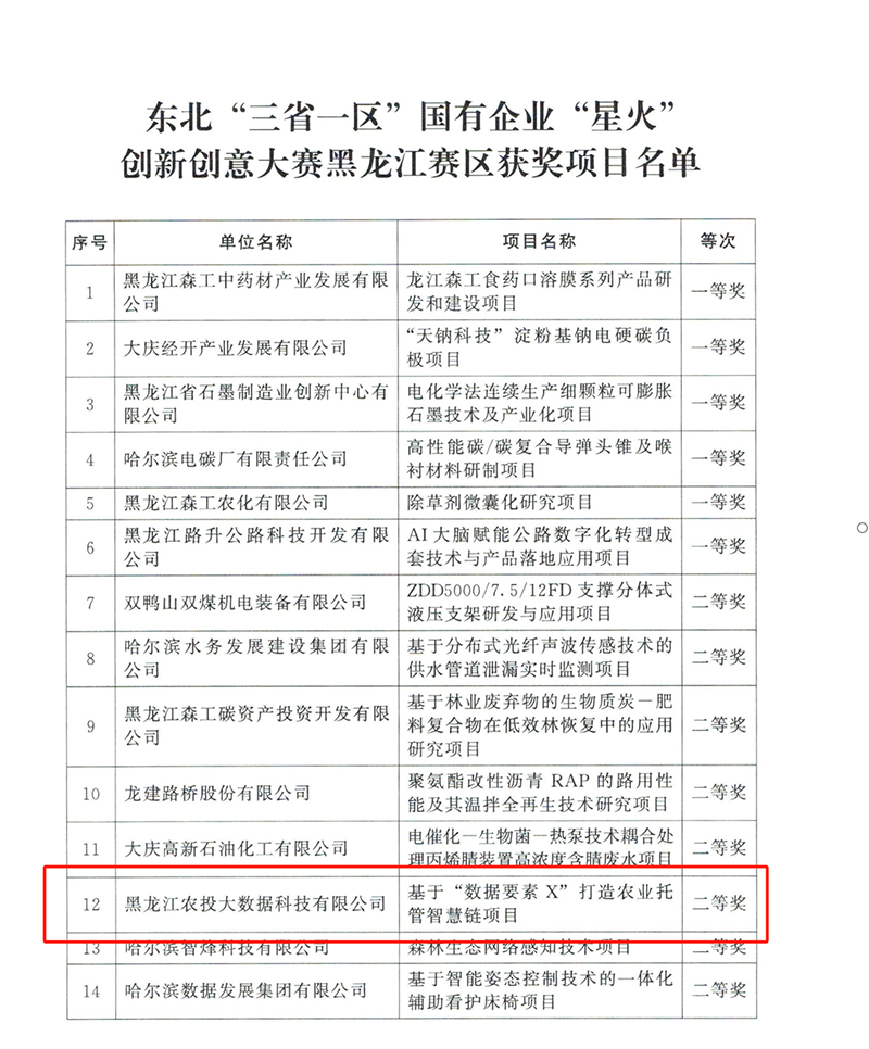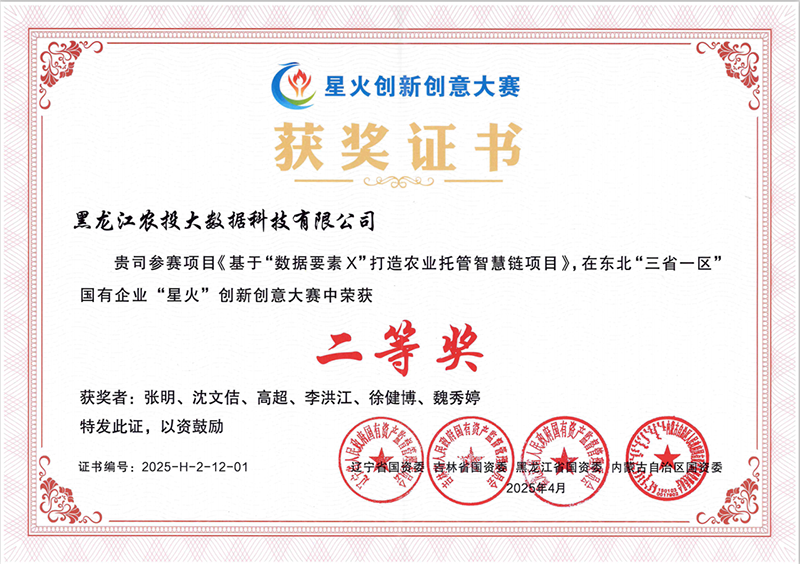 東北“三省一區(qū)”山水相連、人文相親、產(chǎn)業(yè)相融,國資國企發(fā)展資源優(yōu)勢和條件機(jī)遇相似,在科技創(chuàng)新合作有著深厚基礎(chǔ)。 2024年11月至2025年4月,遼寧省國資委、吉林省國資委、黑龍江省國資委、內(nèi)蒙古自治區(qū)國資委聯(lián)合舉辦了東北“三省一區(qū)”國有企業(yè)“星火”創(chuàng)新創(chuàng)意大賽,“三省一區(qū)”的161個項目分獲一、二、三等獎。農(nóng)投大數(shù)據(jù)公司憑借“基于‘?dāng)?shù)據(jù)要素×’打造農(nóng)業(yè)托管智慧鏈項目”從全省百余個參賽項目中脫穎而出,榮獲大賽二等獎。