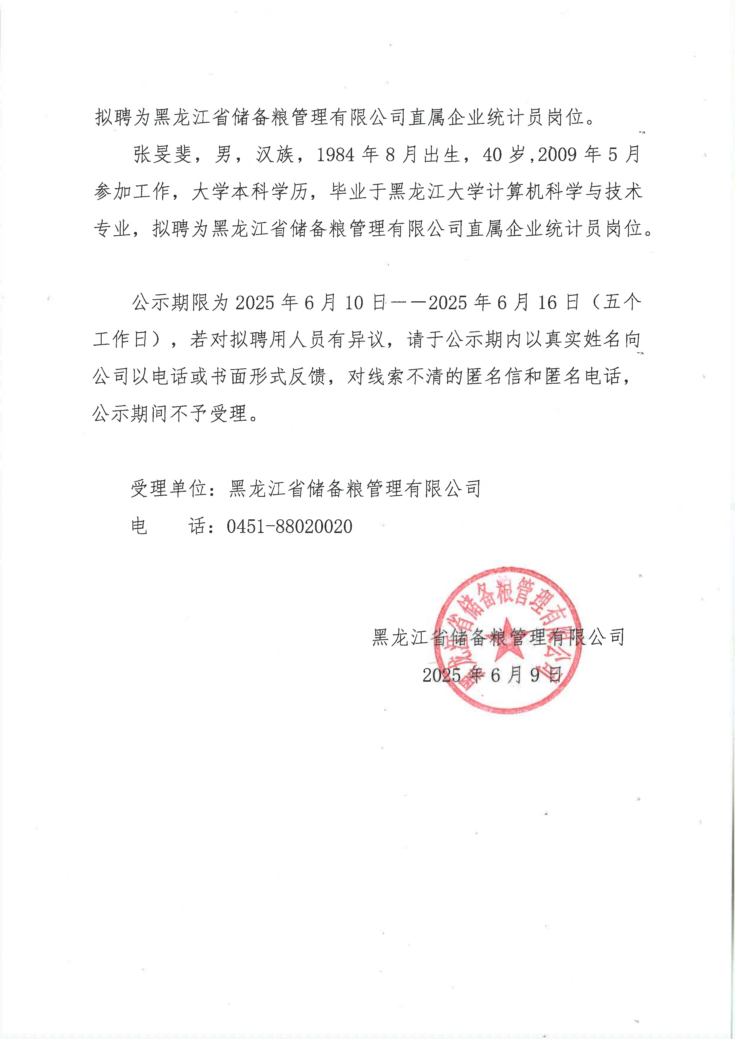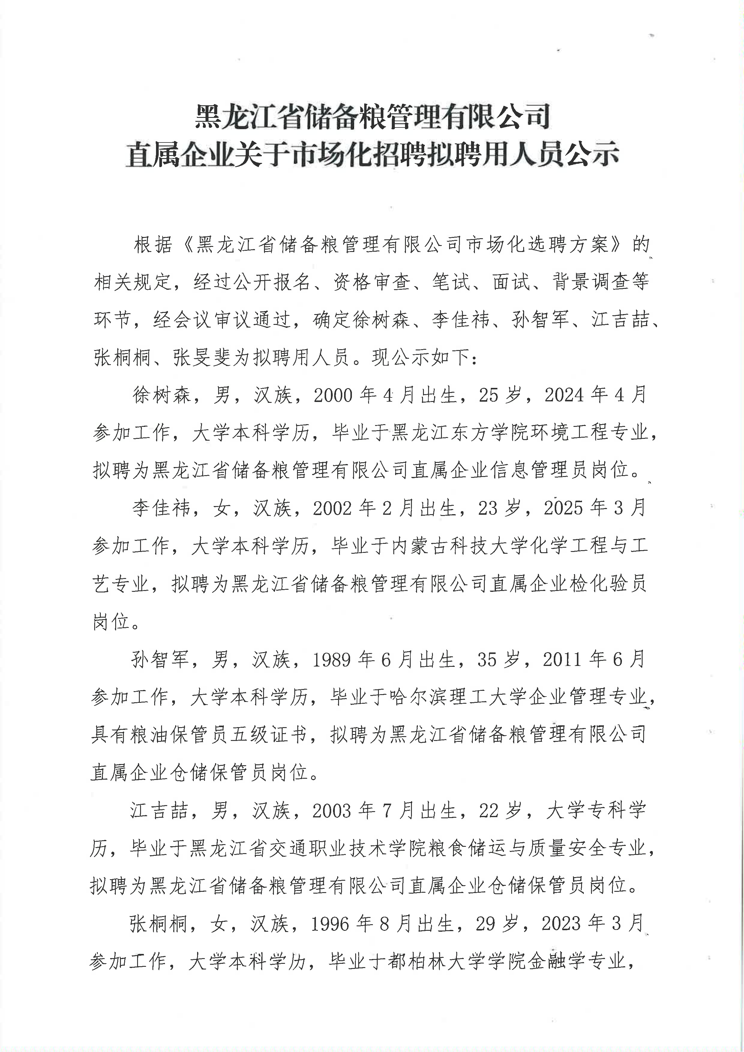 黑龍江省儲備糧管理有限公司直屬企業(yè)關(guān)于市場化招聘擬聘用人員公示